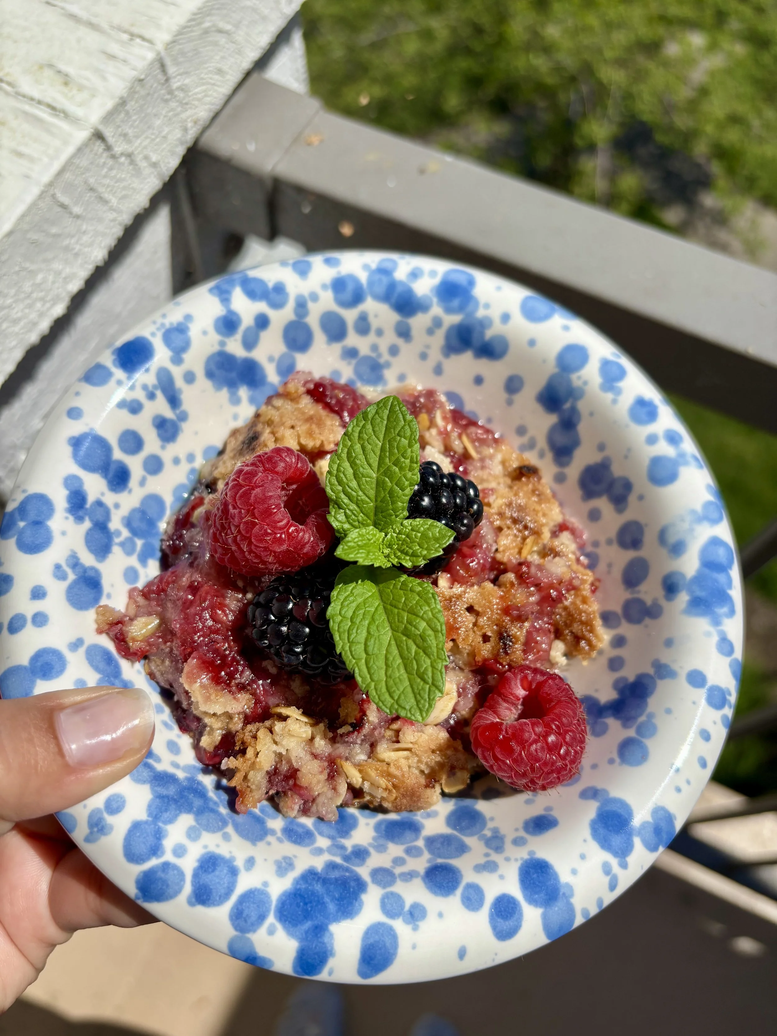 This is such an easy way to use up berries, and it can be made with frozen berries too. It comes out so bright, sweet, and chewy- a perfect dessert for spring or summer!