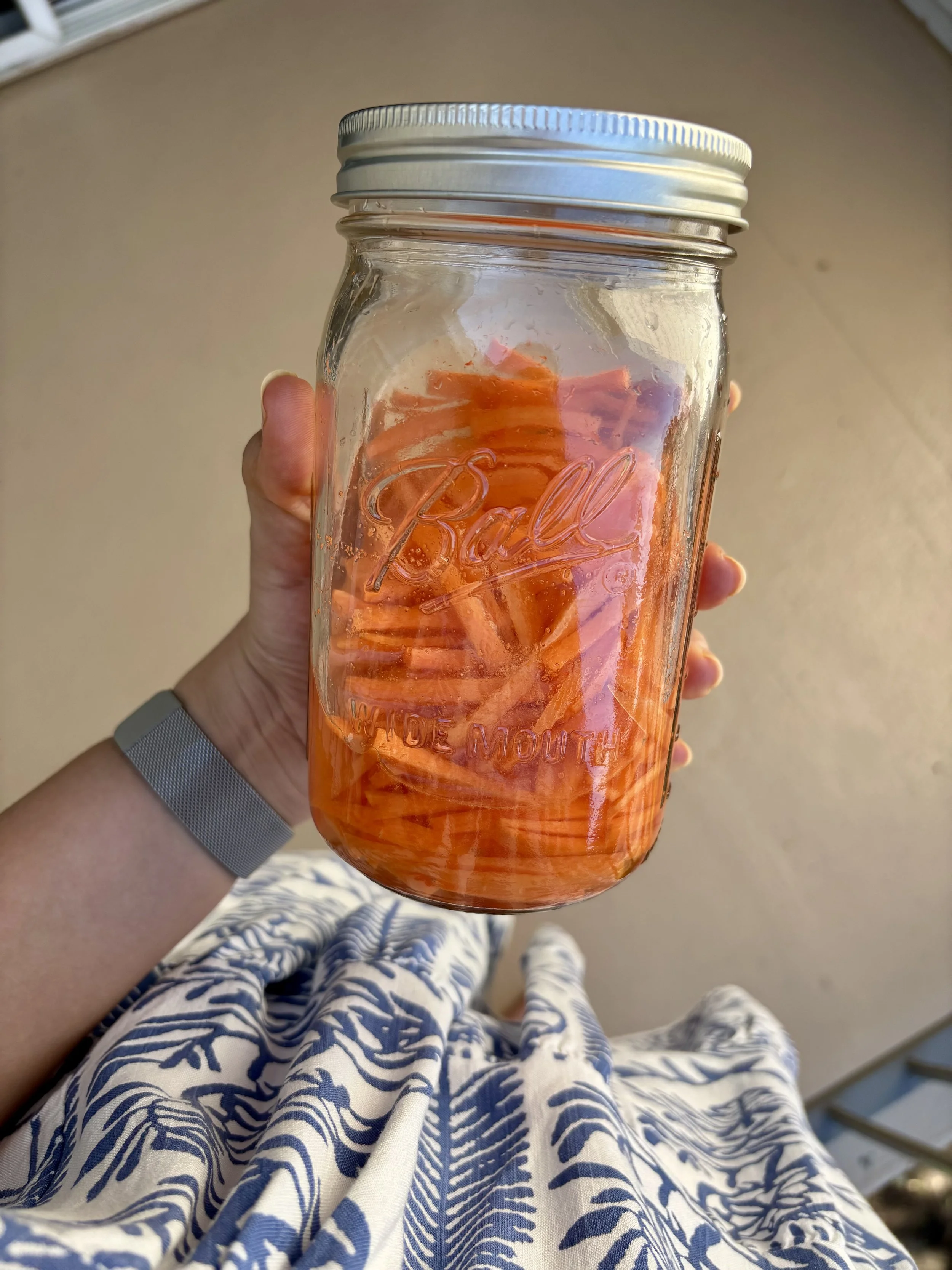 Throw this together for a refreshing and delicious side salad or garnish. It is way easier than you think and comes together in just a few minutes. It’s a great way to use up carrots and will last in the fridge for 3-4 weeks (if you manage to not gobble them up before then!).