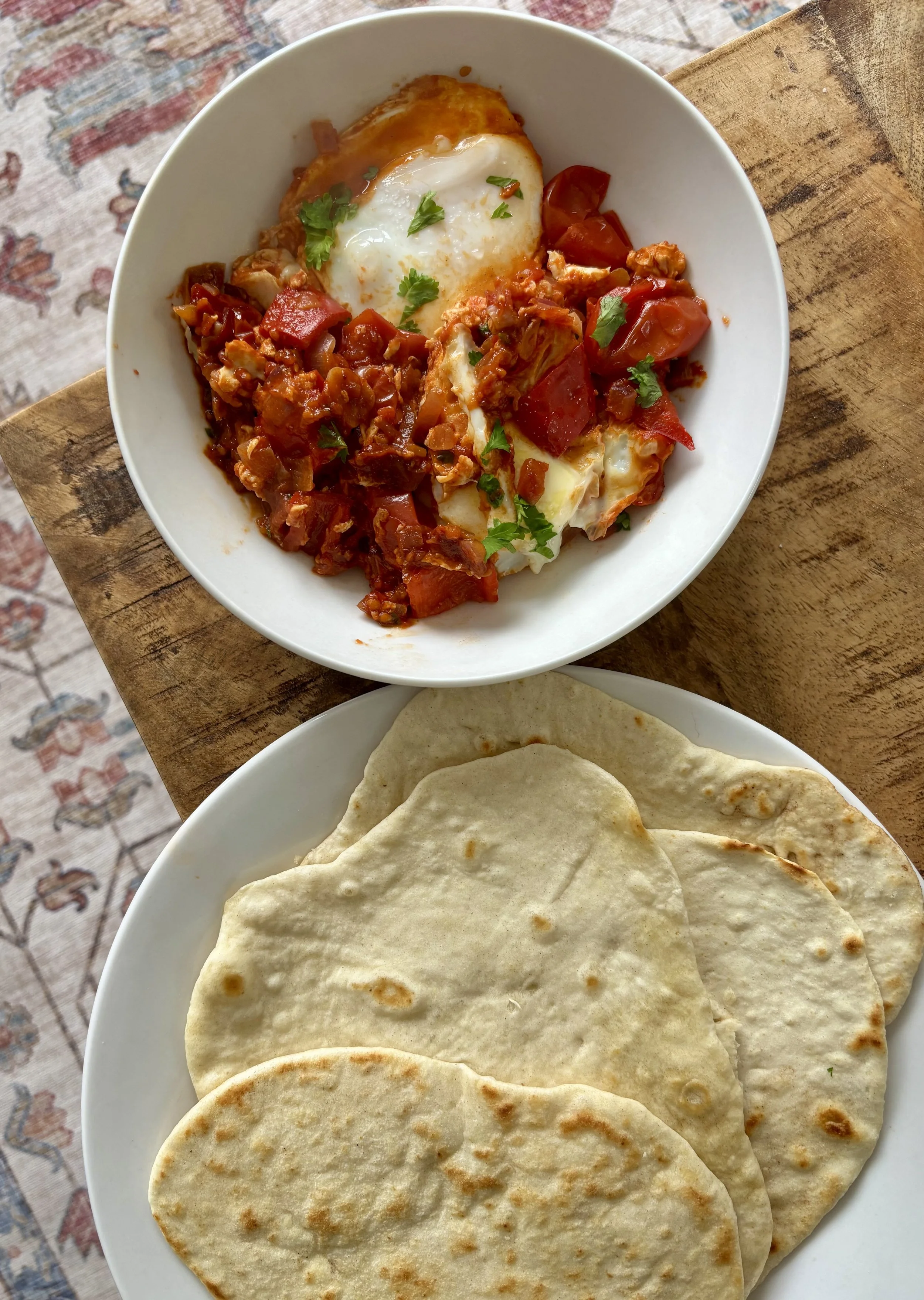 Season eggs with salt and pepper, then garnish with parsley. Serve with flatbreads and enjoy!