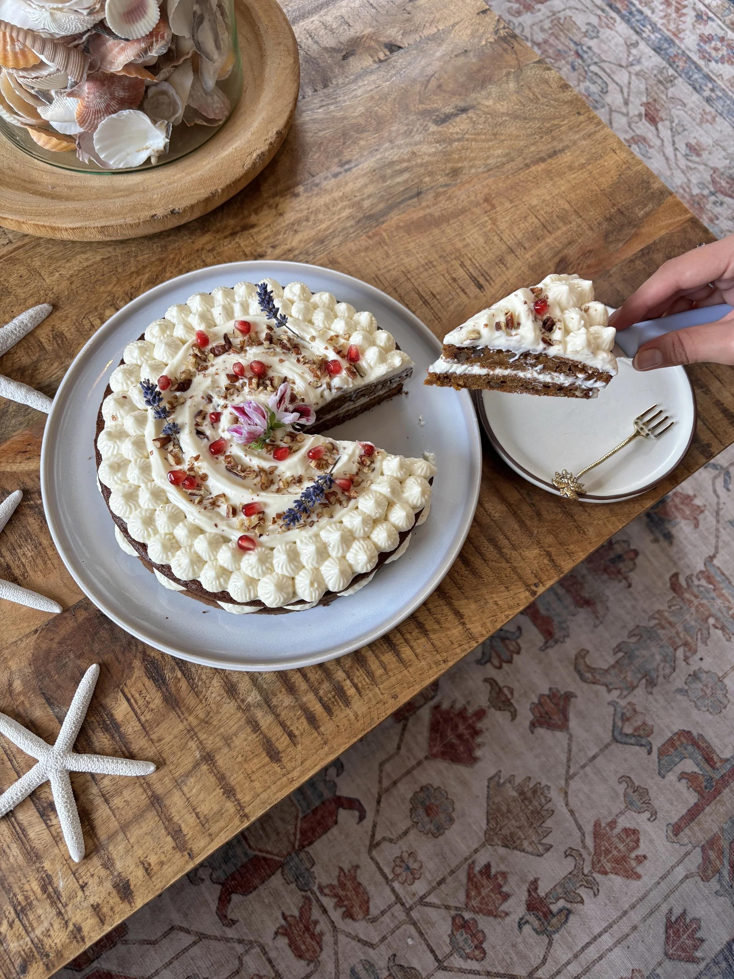 Decorate the cake with flowers, nuts, and fruit (I used pecans, lavender, and pomegranate seeds). Enjoy!