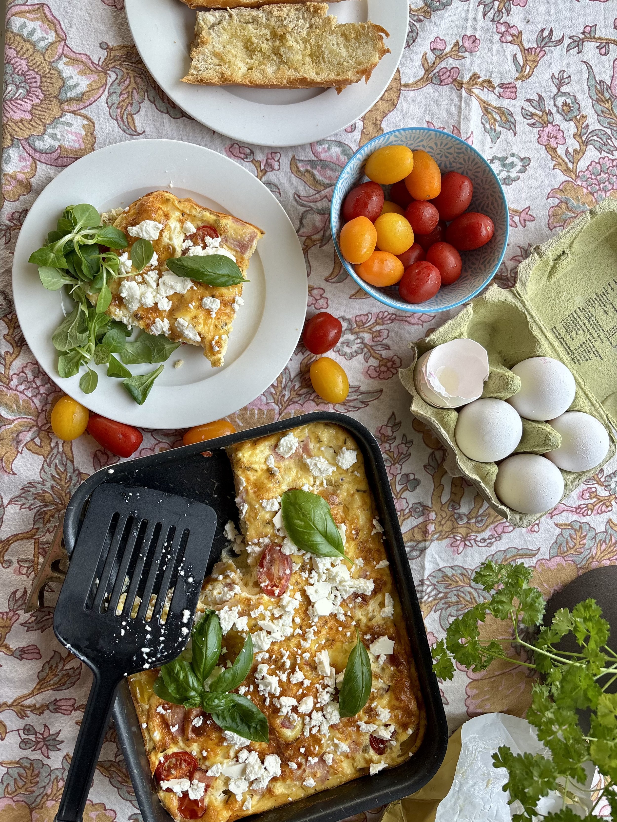 Grease an 8x10” pan and pour the egg mixture into the pan, then sprinkle the remaining feta on top.